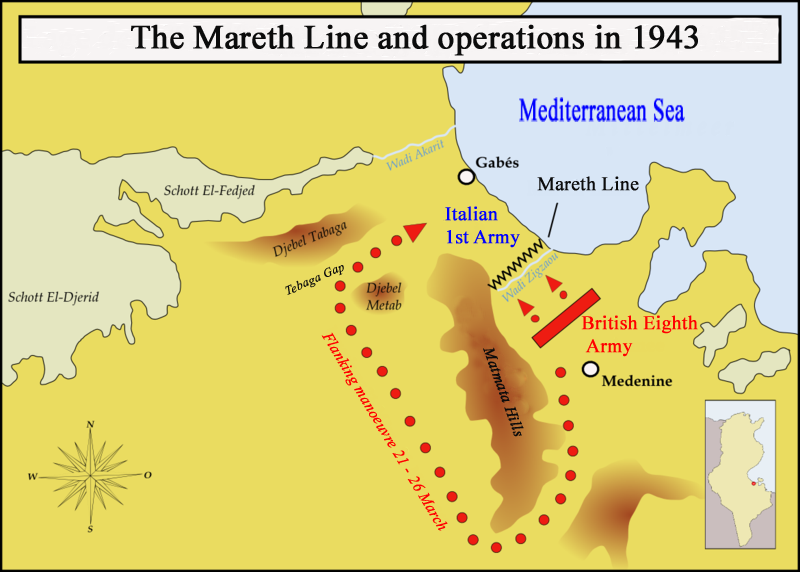The Mareth Line was a pre-war French defensive line designed to prevent Italian incursions from Libya. Situated a few miles south of Mareth, it ran from the sea 22 miles inland to the Matmata Hills.