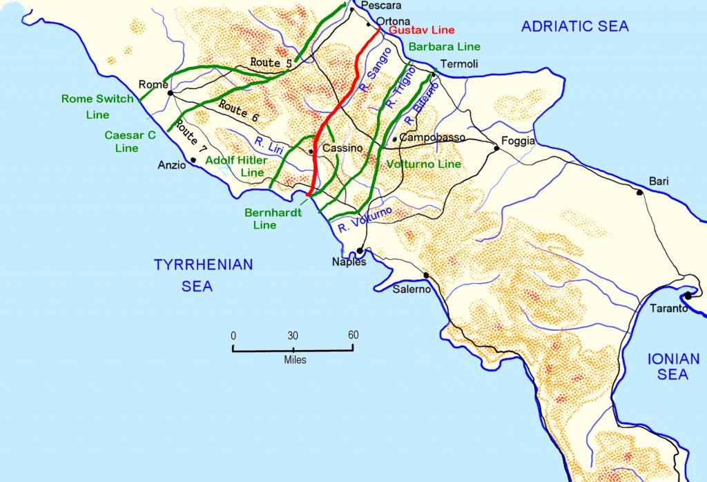 The Trigno is a 53 mile long river originating in the Apennine mountains and flowing out into the Adriatic Sea. The river and the defensive positions along it was a continuation of the Barbara Line, one of several defensive lines built by the Germans to try to halt the allied advance further north.